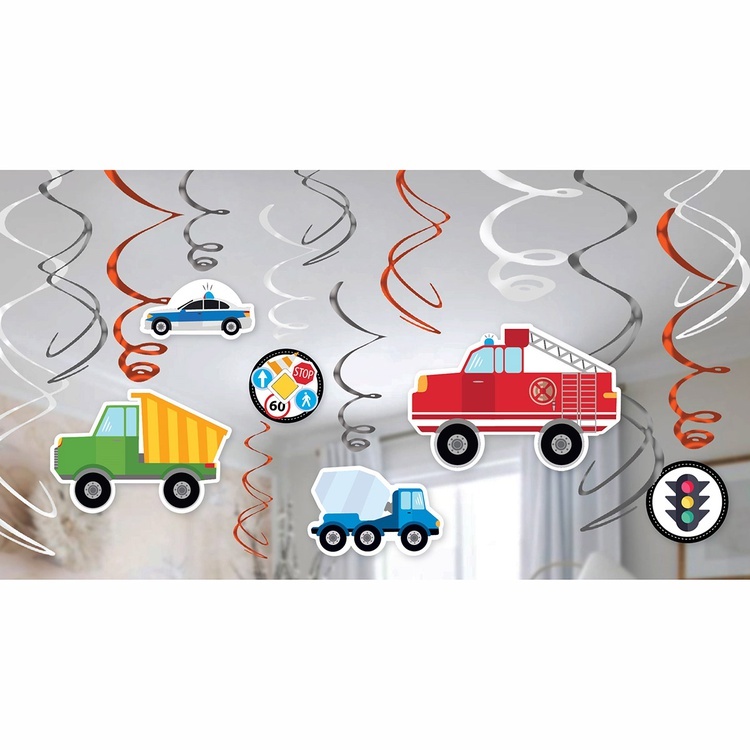 Декорация в виде фольгированных спиралей. В комплекте: 6 спиралей без баннера и 6 спиралей с баннерами с изображением машинок.