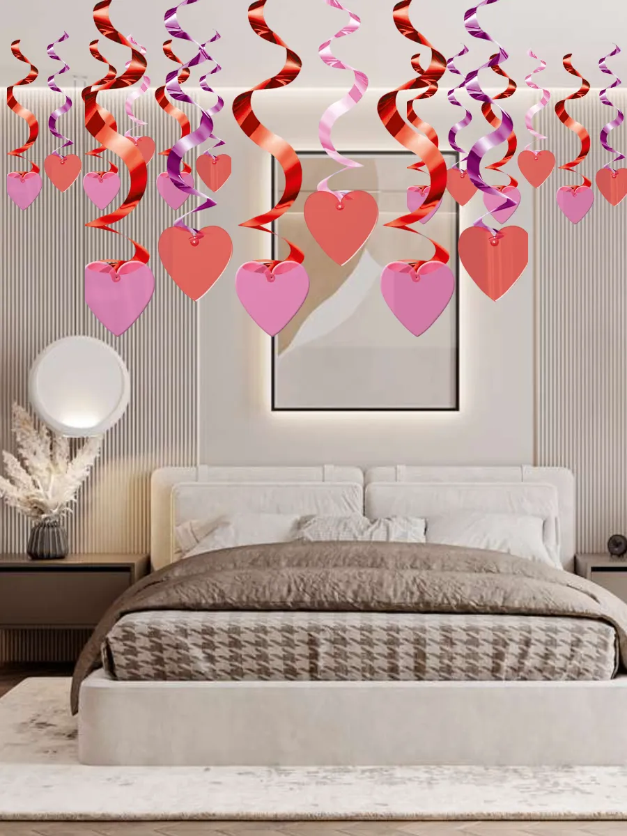 Декоративные элементы из яркой фольги в виде розовых и алых спиралей с сердцами. Эти сверкающие украшения станут прекрасным дополнением к любому интерьеру, придавая ему неповторимое очарование и атмосферу праздника.