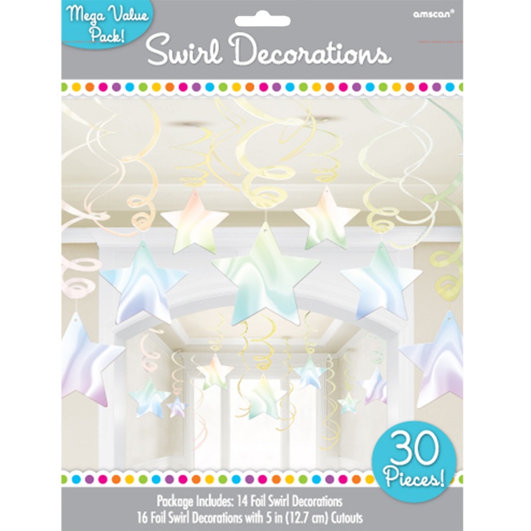 В наборе 30 спиралей (14 простых спиралей и 16 пластиковых спиралей с баннерами в виде звездочек размером 13 см). Каждая спираль снабжена пластиковым колечком с прорезью для крепления. Размер спиралей вы можете варьировать самостоятельно от 46 до 60 см.