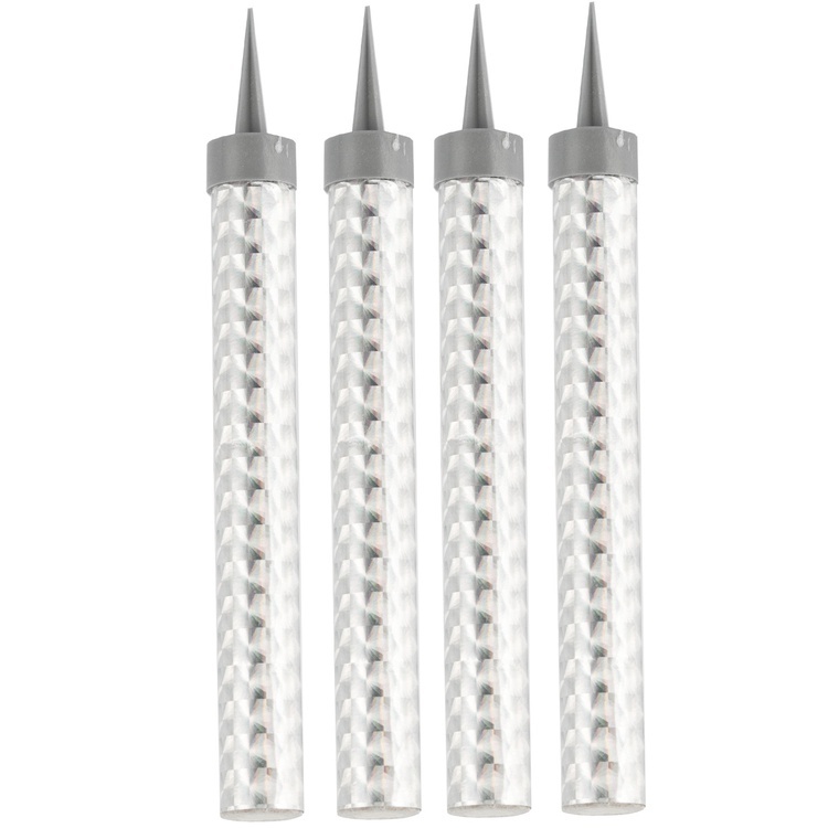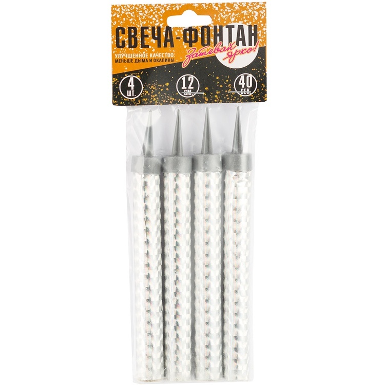 Каждая свеча оснащена пластмассовой пикой для удобной установки. Высота свечи — 12 см, время горения — 40 секунд. В упаковке 4 свечи.