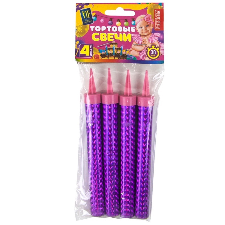 Каждая свеча оснащена пластмассовой пикой для удобной установки. Высота свечи — 12 см, время горения — 30 секунд. В упаковке 4 свечи.