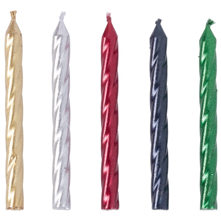Элегантные цветные свечи с металлическим блеском станут эффектным украшением праздничного торта или десерта. Универсальное решение для дня рождения, юбилея или новогоднего торжества.