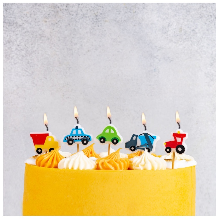 Декоративное украшение праздничного стола. Разноцветные свечи в виде машинок на пиках. Отличное решение для декорирования торта, десерта ко Дню рождения, Юбилею, для детских прздников. Стеарин, оригинальный дизайн. 5 штук в упаковке.