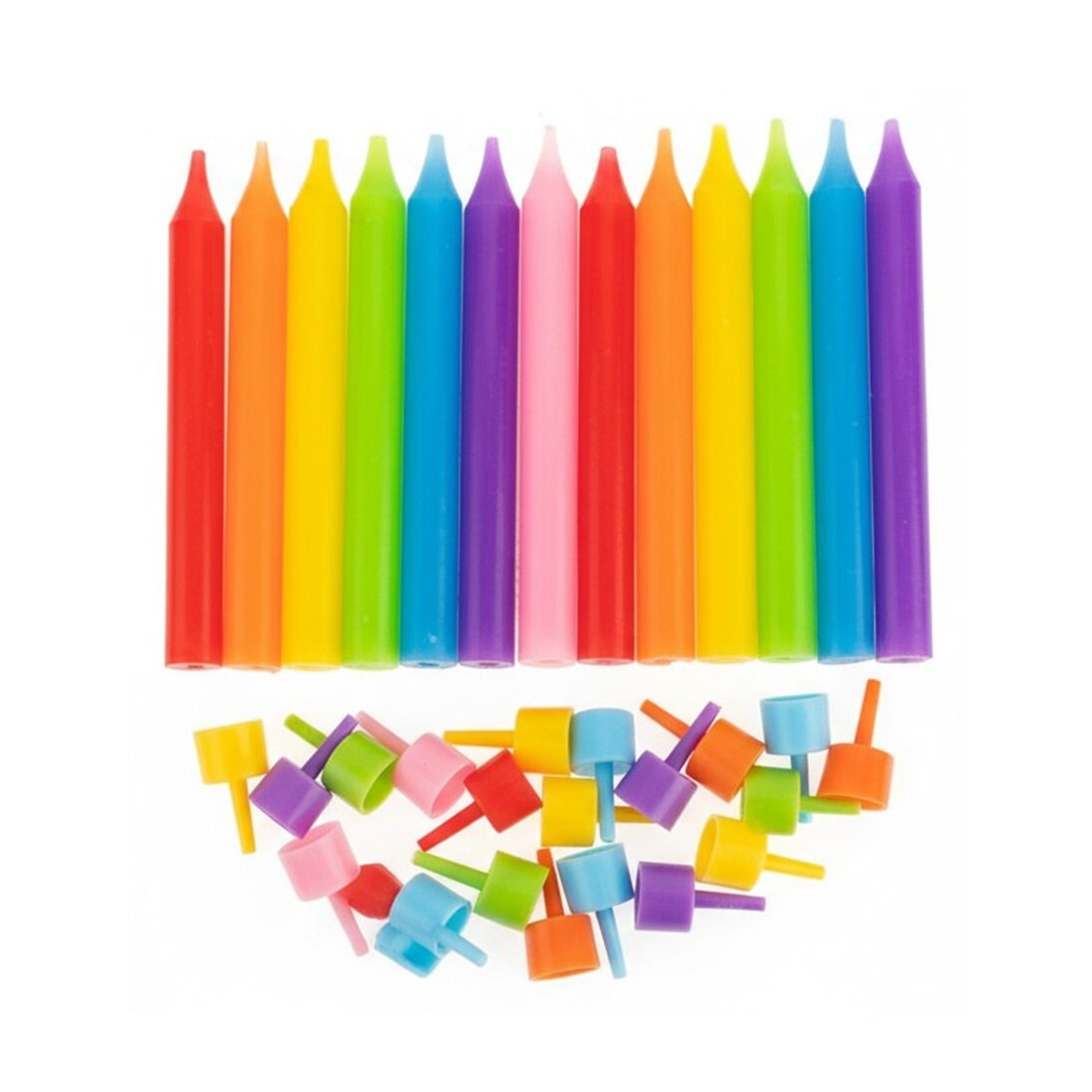 Высота свечи — 8 см (без подставки), дополнительная высота держателя — 1 см. В упаковке 12 штук — готовое решение для торта любого размера.