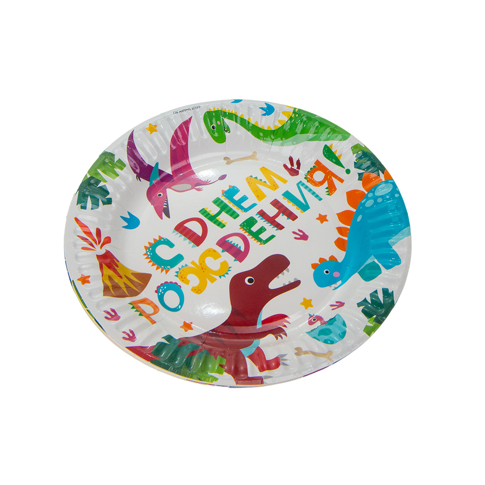 Праздничные бумажные тарелки в ярком цвете с динозавриками станут стильным элементом сервировки для праздника. Лаконичное сочетание оттенков подчёркивает торжественность момента и красиво дополняет тематический декор стола.
