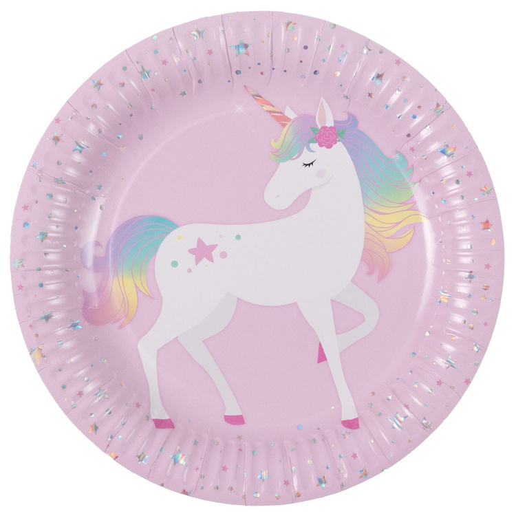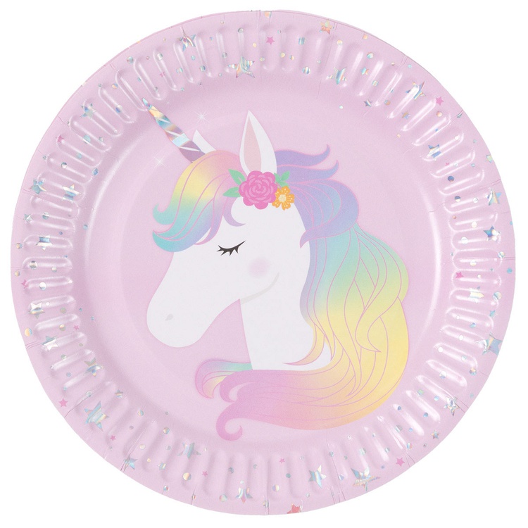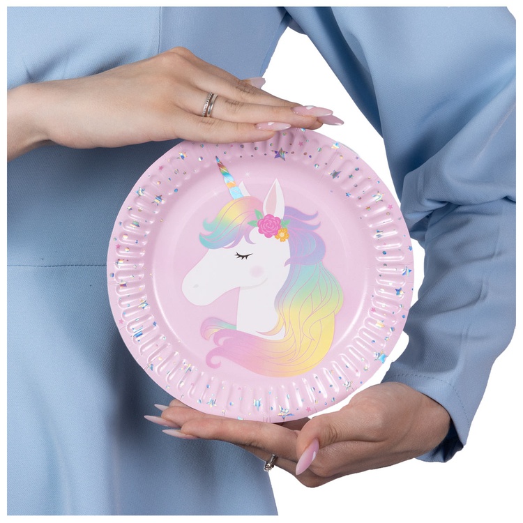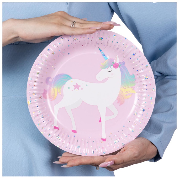 Праздничные бумажные тарелки из коллекции «Единорог дивный» станут стильным элементом сервировки для праздника. Лаконичное сочетание оттенков подчёркивает торжественность момента и красиво дополняет тематический декор стола.