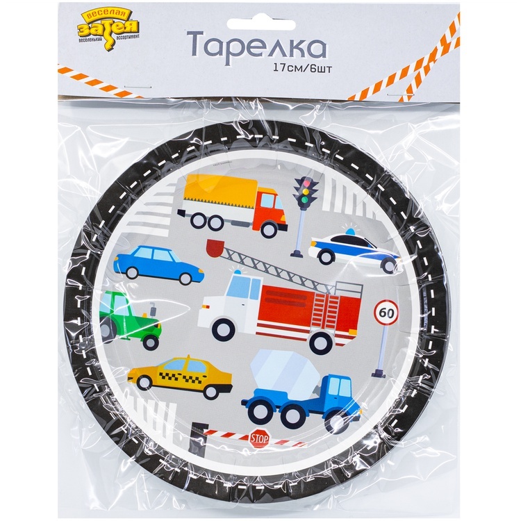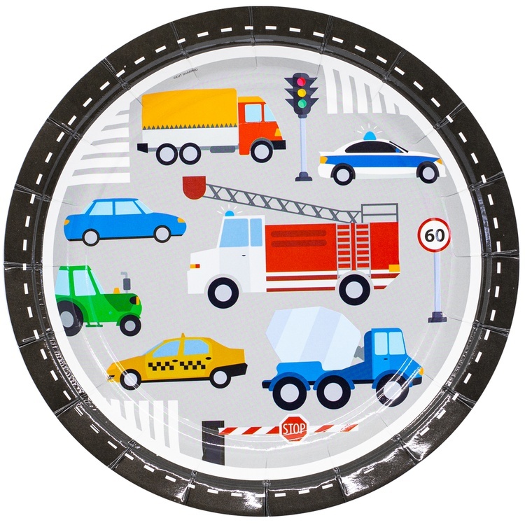 Стильные бумажные тарелки с рисунком машинок — это оригинальный и яркий элемент сервировки, который подойдёт для оформления праздничного стола.