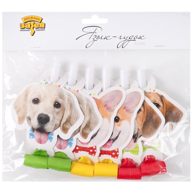 Весёлые язычки-гудки с ярким дизайном «Собачки» станут эффектным дополнением любого праздника. При каждом выдохе они издают забавный звук и разворачиваются в яркую форму, создавая атмосферу радости и веселья.